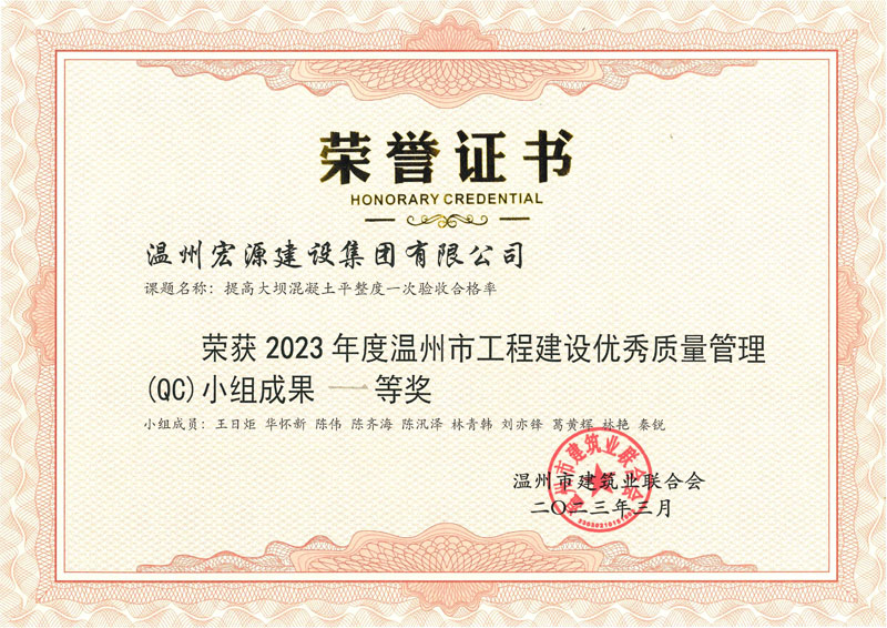 2023年度溫州市工程建設(shè)優(yōu)秀度質(zhì)量管理小組成果一等獎(jiǎng)
