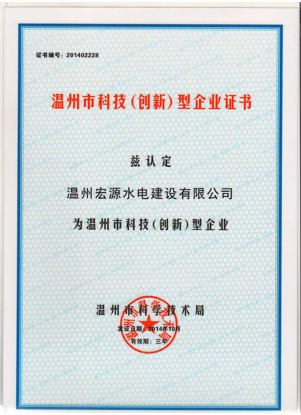溫州市科技(創(chuàng)新)型企業(yè)證書