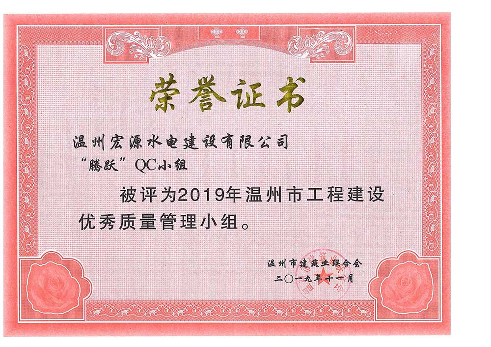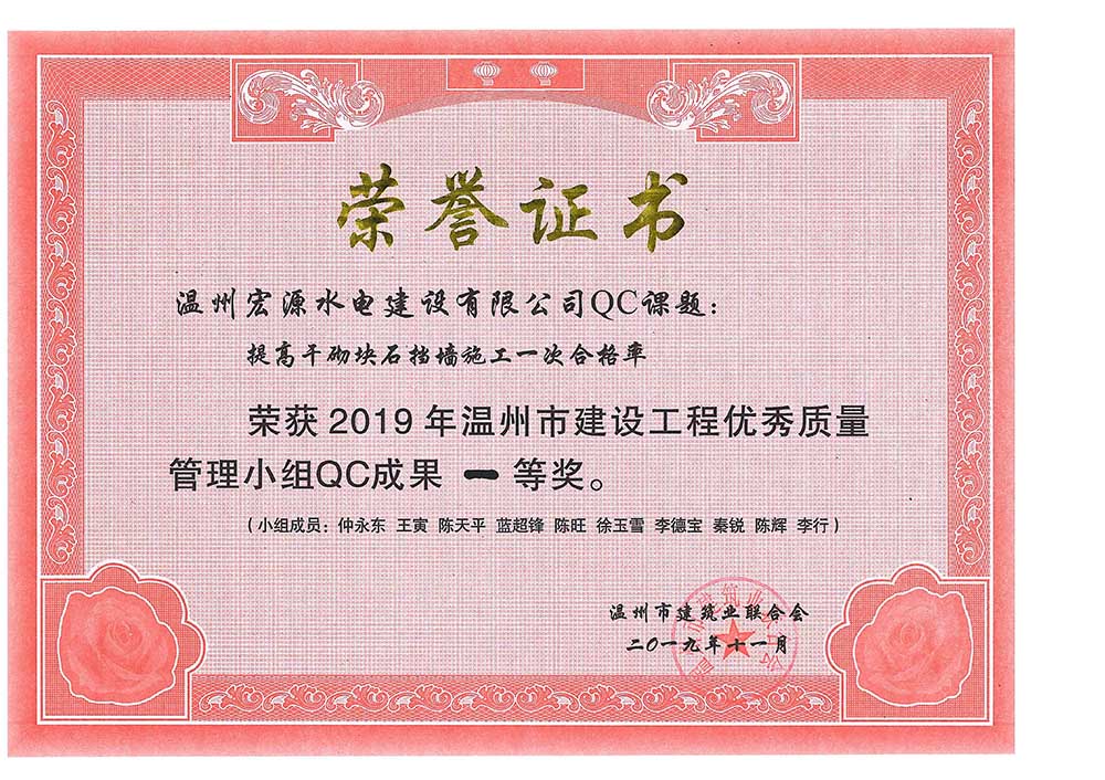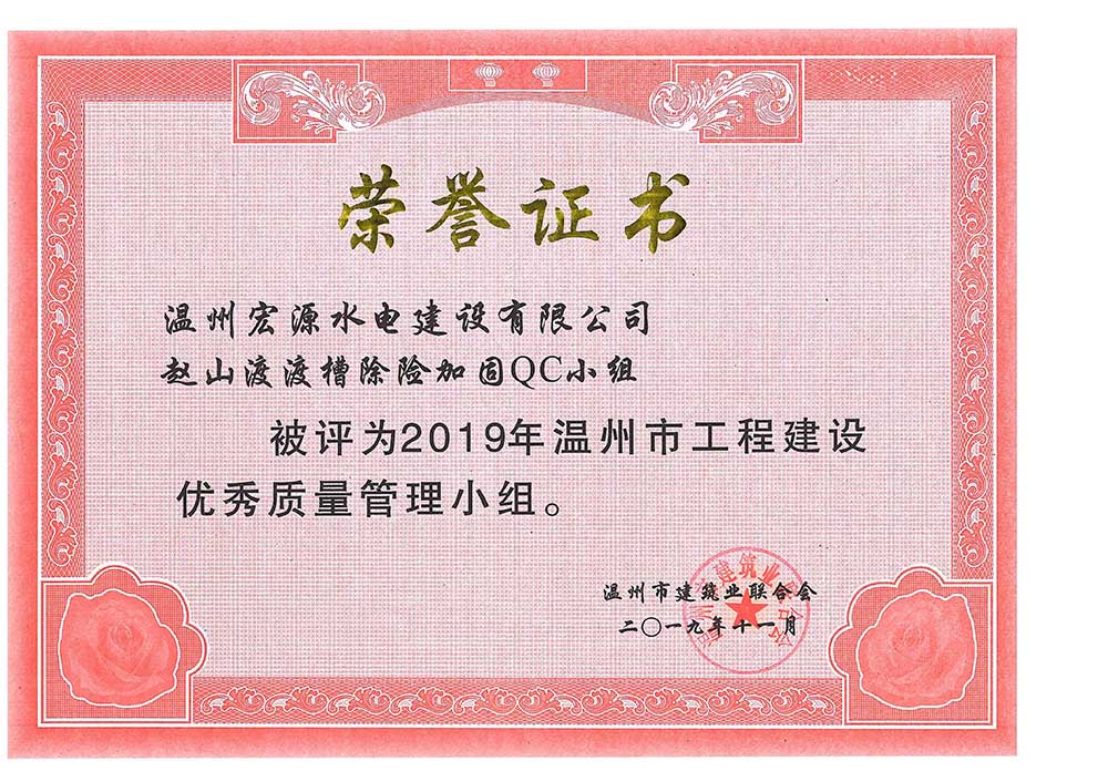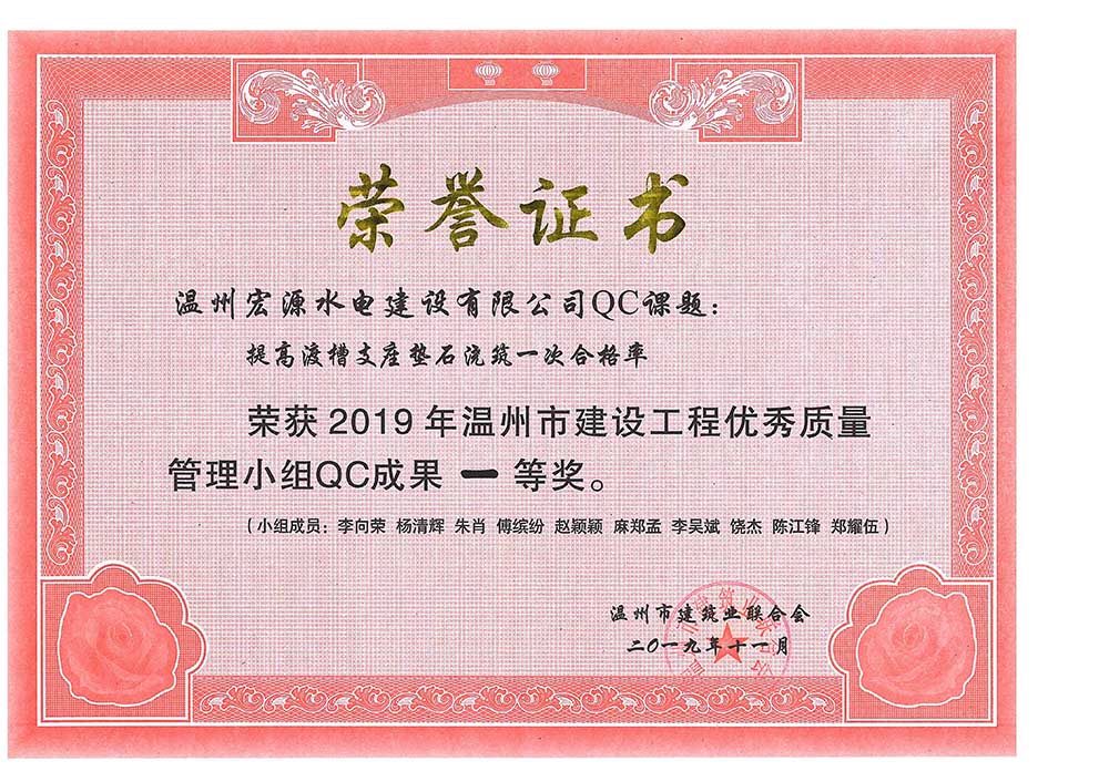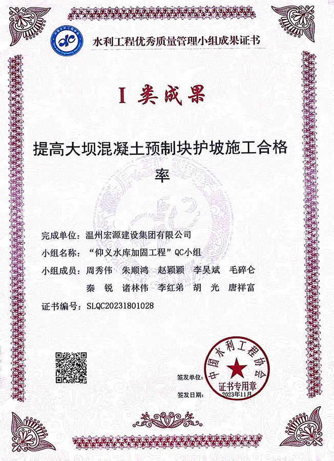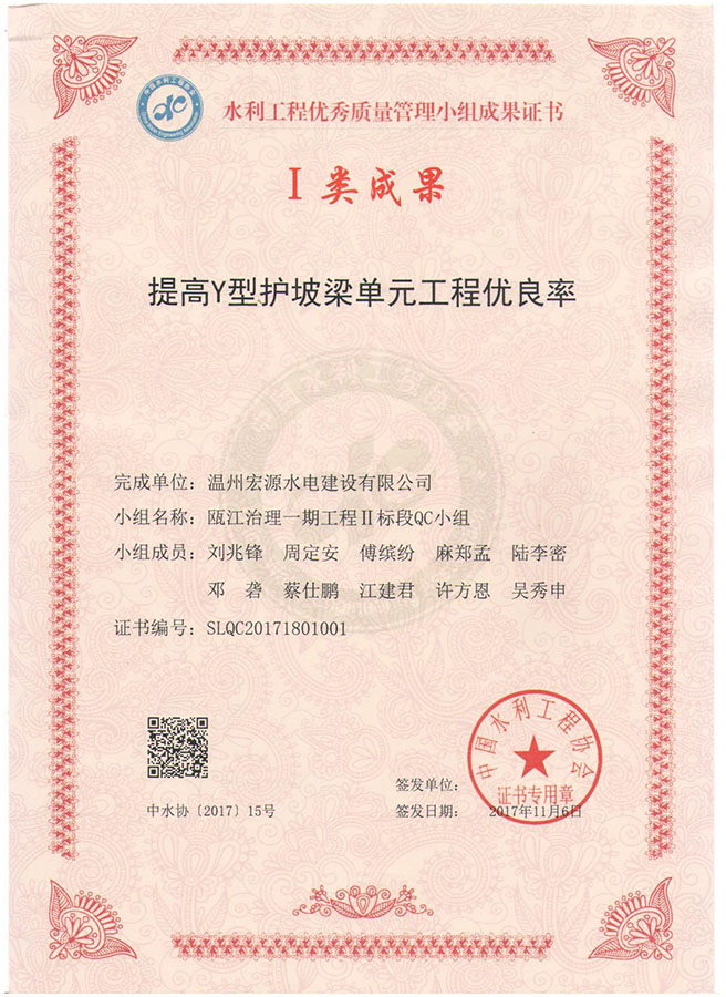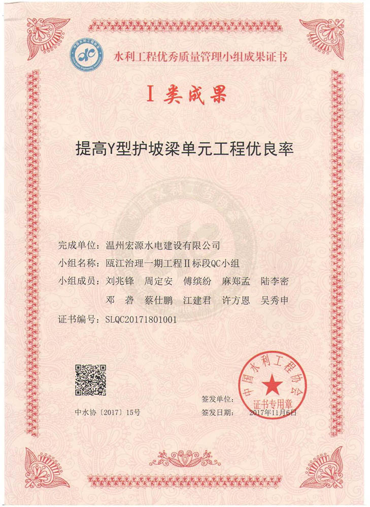 水利工程優(yōu)秀質(zhì)量管理小組成果證書Ⅰ類成果