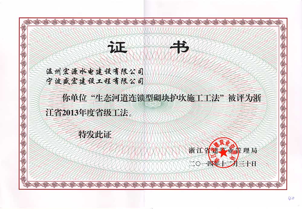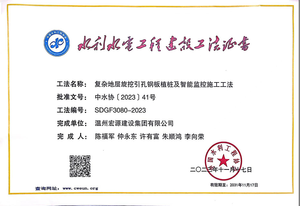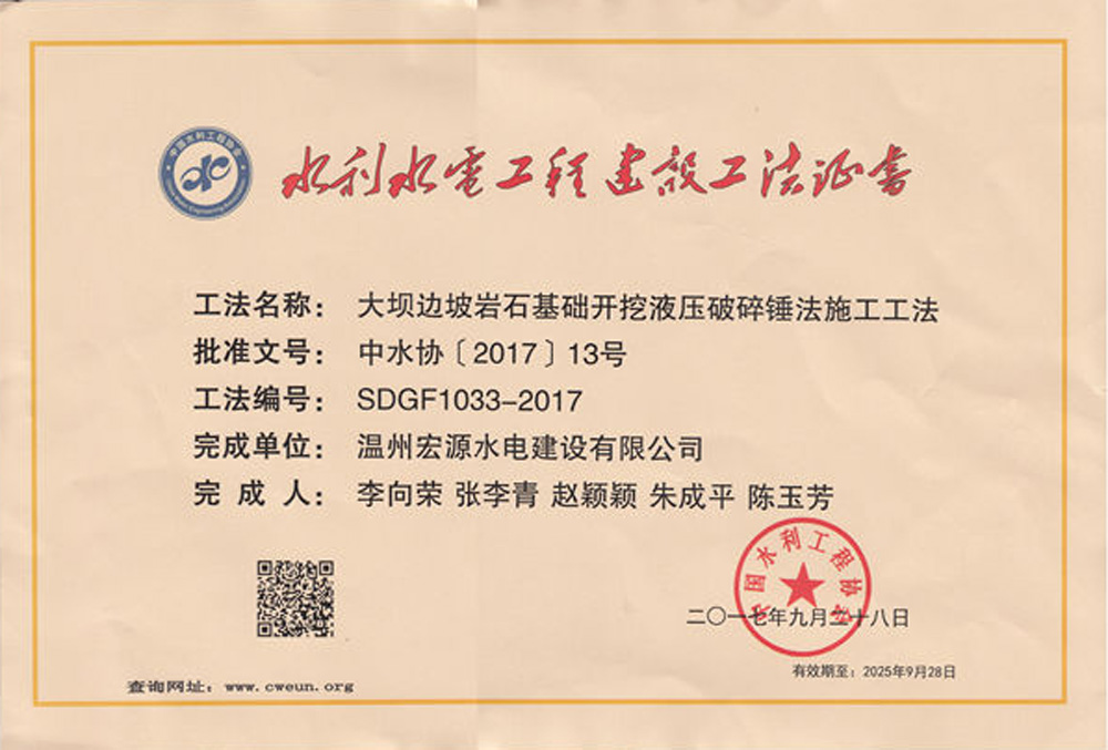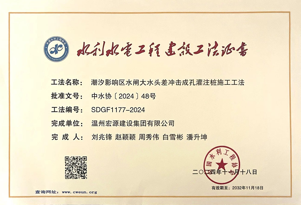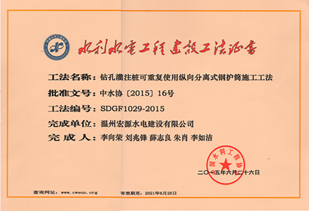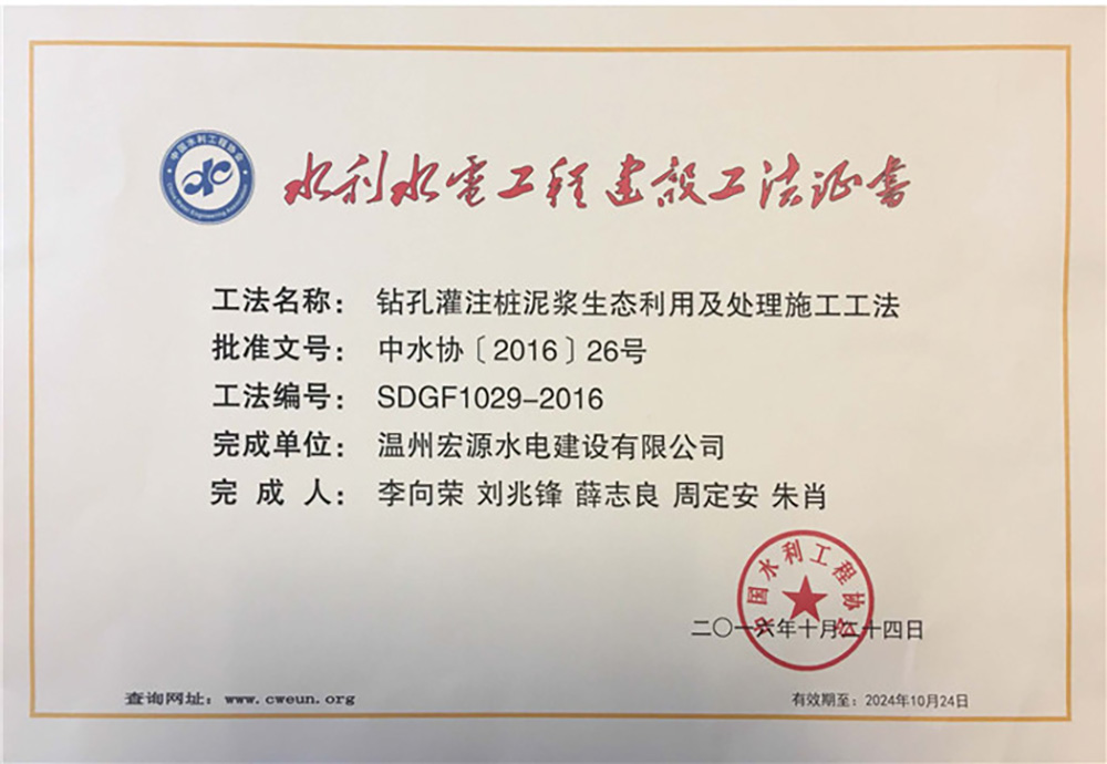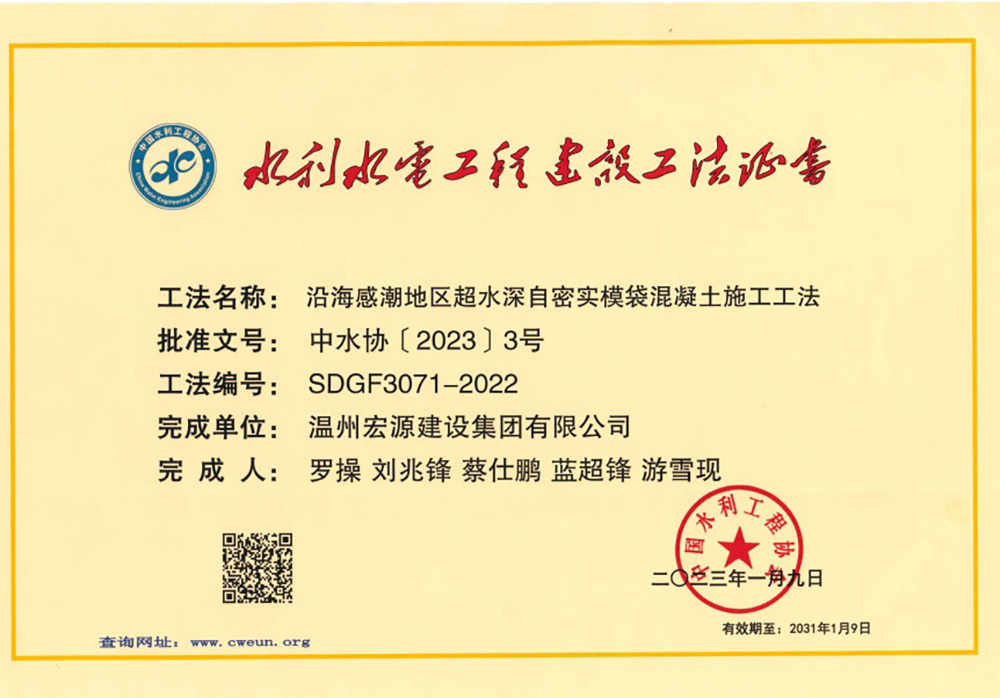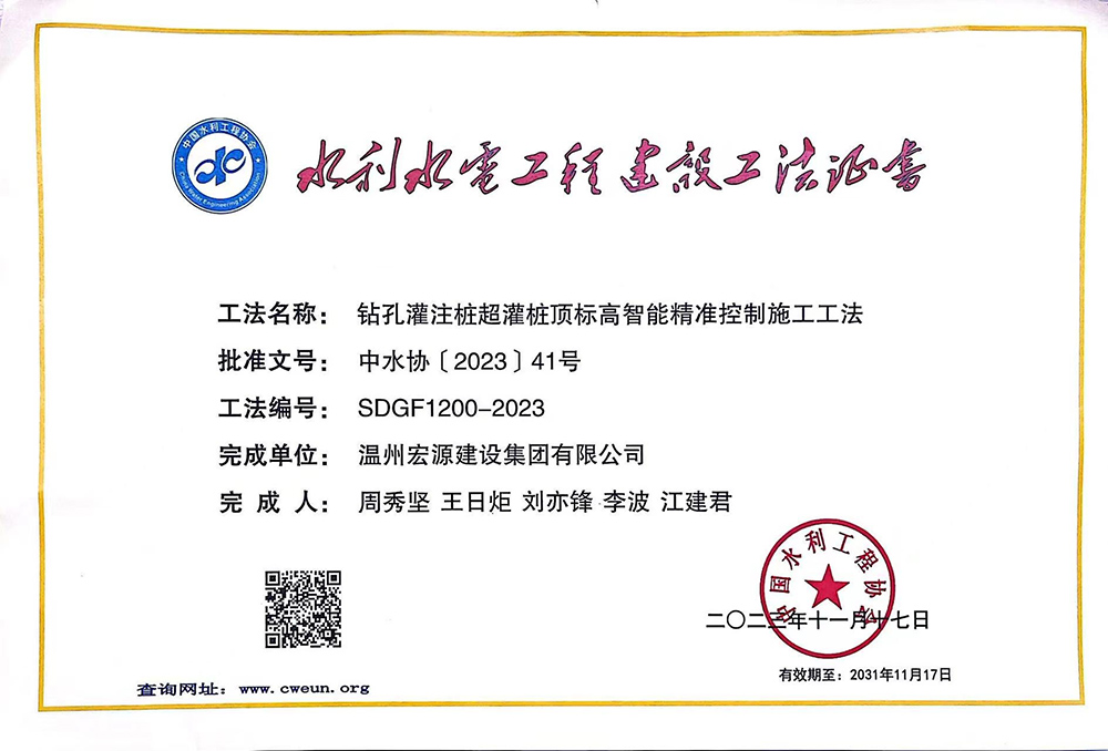 水利工程優(yōu)秀質(zhì)量管理小組成果證書Ⅰ類成果