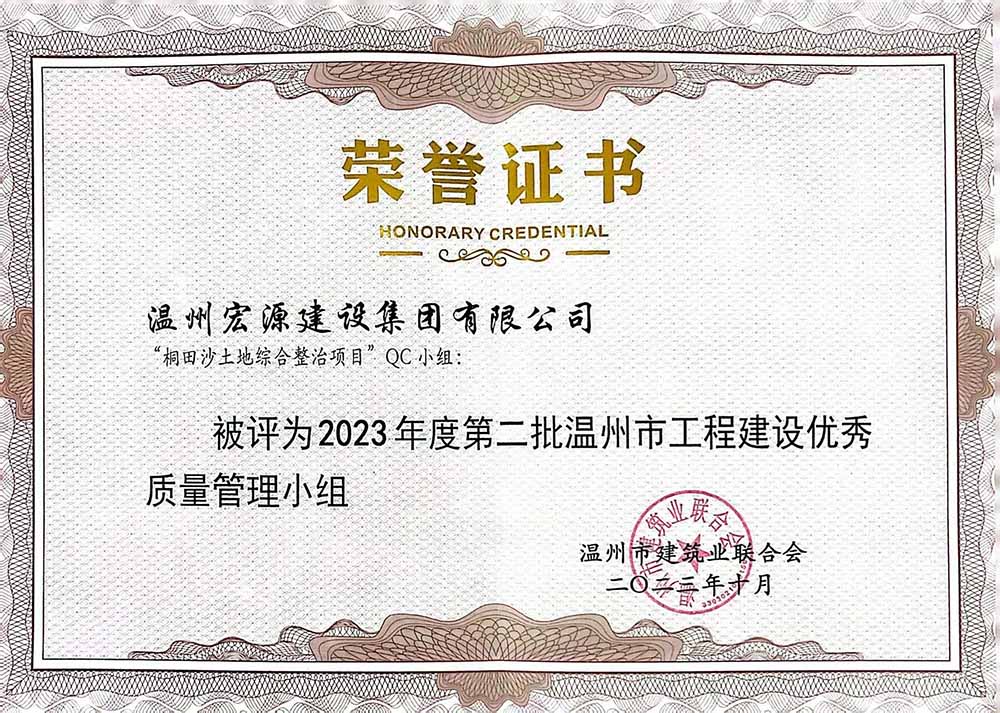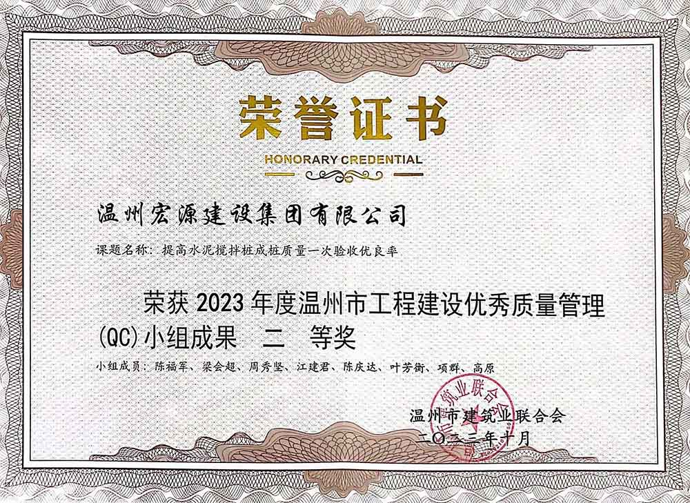 2023年度溫州市工程建設(shè)優(yōu)秀質(zhì)量管理(QC)小組成果二等獎(jiǎng)