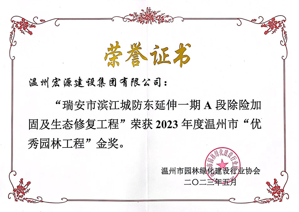 瑞安濱江城防項(xiàng)目 市園林金獎(jiǎng) 省園林金獎(jiǎng)證書