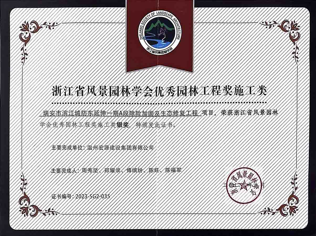 瑞安市濱江城防東延伸一期A段除險(xiǎn)加固及生態(tài)修復(fù)工程榮獲浙江省風(fēng)景園林學(xué)會(huì)優(yōu)秀園林工程獎(jiǎng)施工類銀獎(jiǎng)