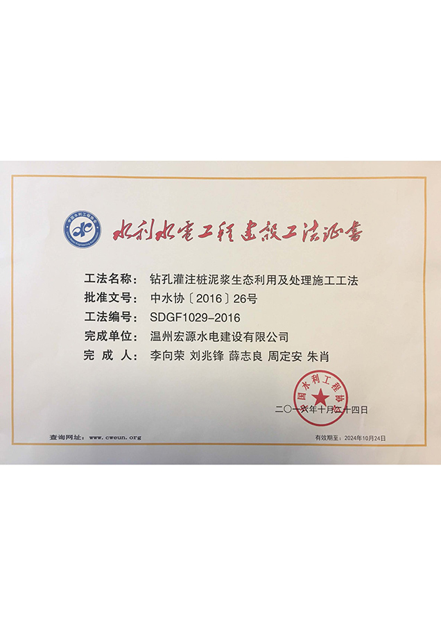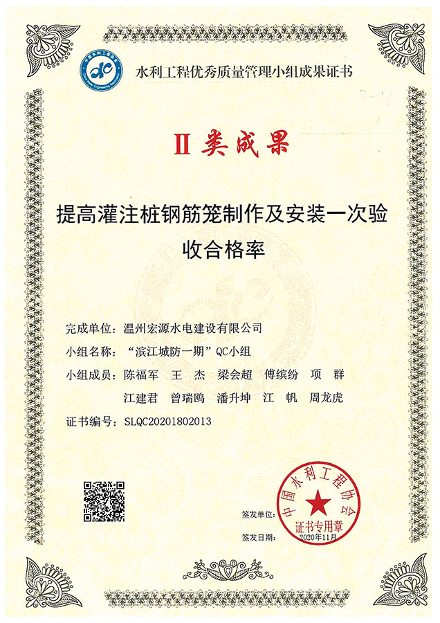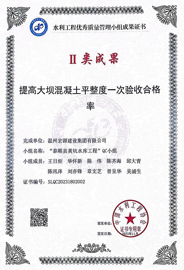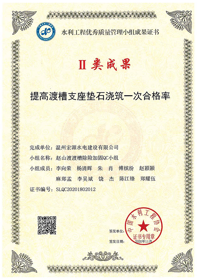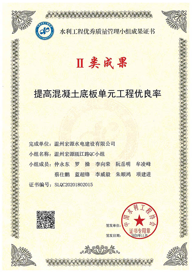 水利工程優(yōu)秀質(zhì)量管理小組成果證書Ⅱ類成果