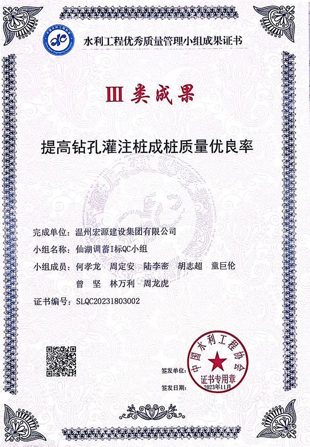 水利工程優(yōu)秀質(zhì)量管理小組成果證書Ⅲ類成果