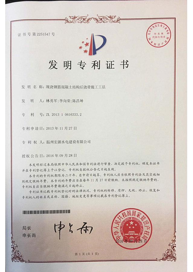 現(xiàn)澆鋼筋混凝土結(jié)構(gòu)后澆帶施工工法專利證書