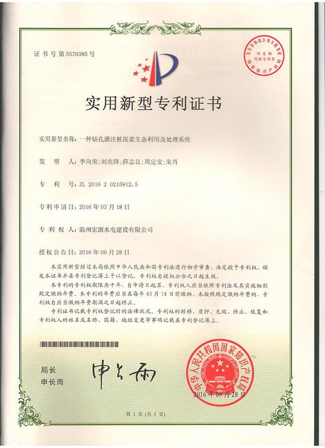 一種鉆孔灌注樁泥漿生態(tài)利用及處理系統(tǒng)專利證書