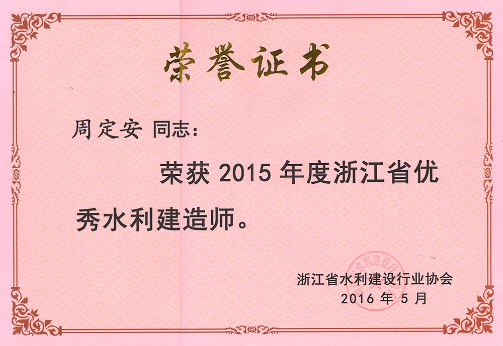 周定安2015年度浙江省優(yōu)秀水利建造師
