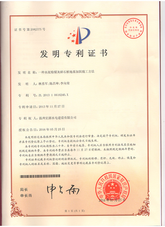 一種水泥粉煤灰碎石樁地基加固施工方法專利證書
