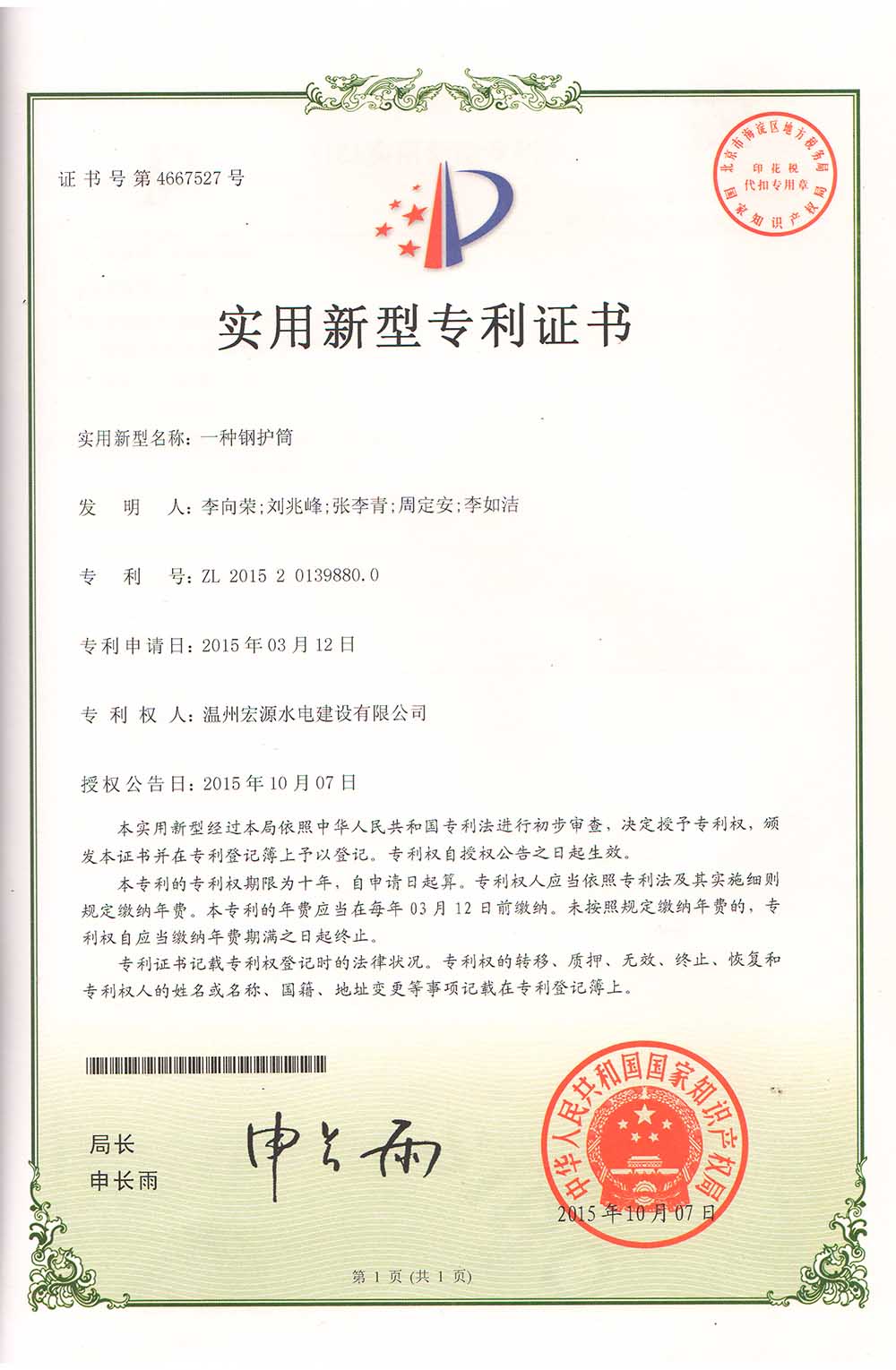 實(shí)用新型專利證書(一種鋼護(hù)筒)