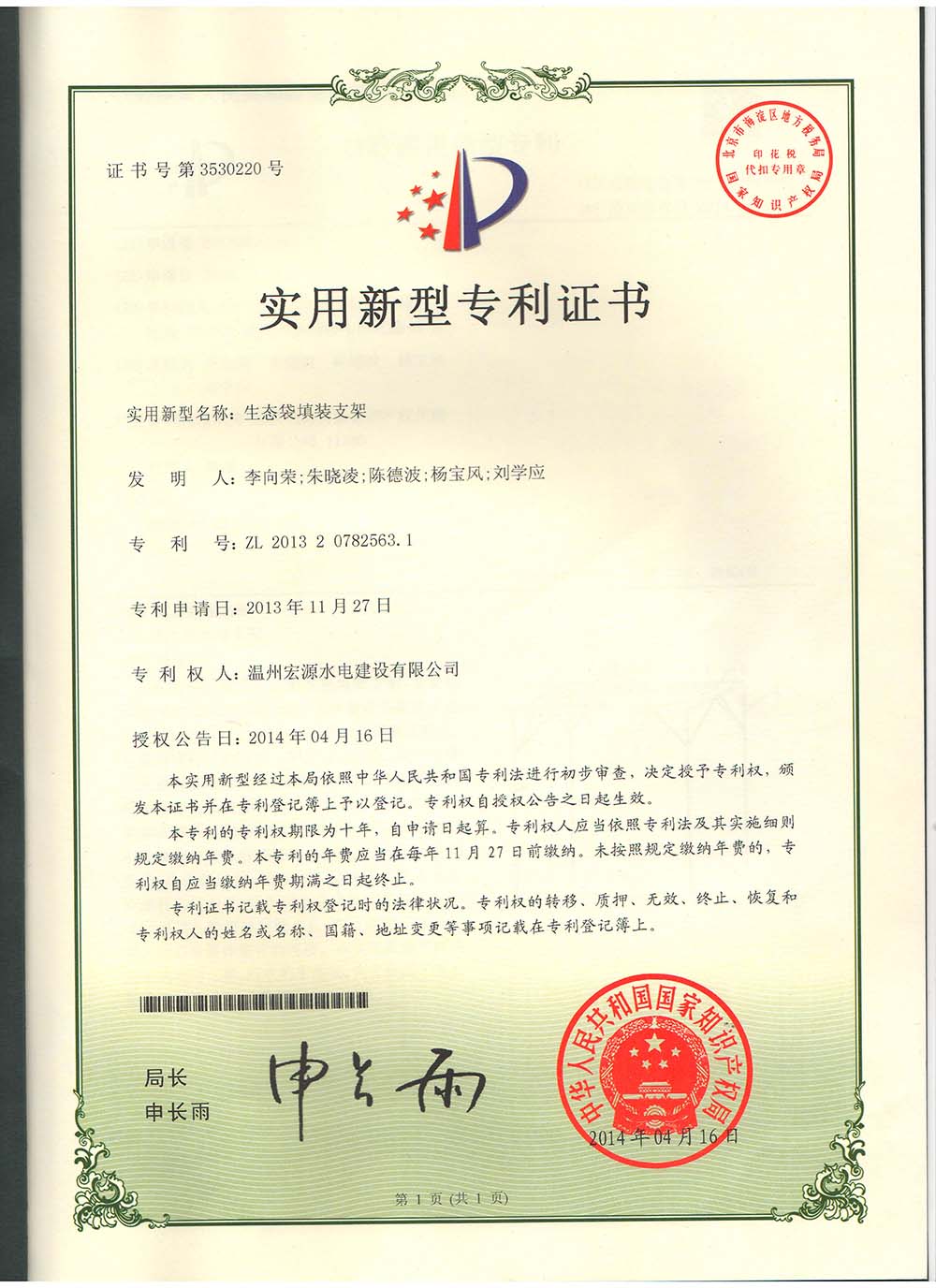 實(shí)用新型專利證書(生態(tài)袋填裝支架)