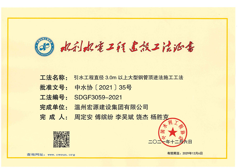 引水工程直徑3.0m以上大型鋼管頂進(jìn)法施工工法證書-1