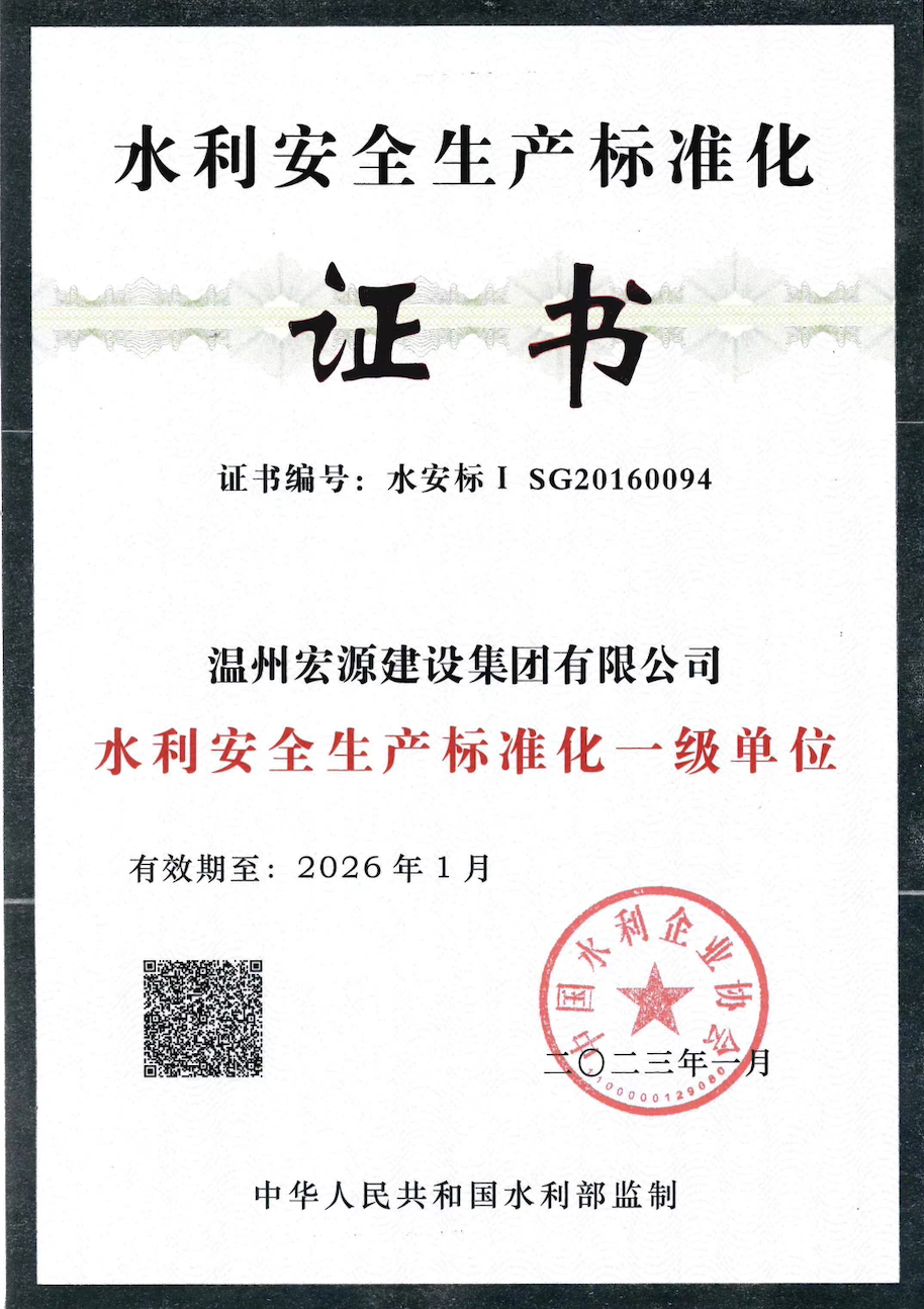 水利安全生產(chǎn)標(biāo)準(zhǔn)化一級(jí)單位證書
